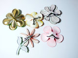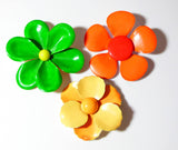 Retro Flower Power Enamel Flower Pins. 5 fun and colorful retro enamel flower pins. The largest green flower is 3" in diameter and the smallest is 2 1/4" in diameter. The orange flower is actually more of a reddish orange, for some reason it photographs bright orange. Very good condition, the peach colored flower has some scratches. circa 1950's.