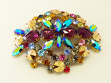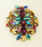 Rhinestone Bijoux MG Czech Glass Huge Brooch. Set in non-plated brass. Signed Bijoux MG. This has purple tear drop stones, blue AB navettes, multicolored round 6 mm faceted rhinestones and large 10mm round bronze metallic stones. Measures 4" (10.16 cm) by 3 1/4" (8.255 cm) Excellent condition.