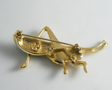 Rhinestone Enamel Green Grasshopper Figural Pin set in gold tone metal. The eye is a blue tiny crystal rhinestone and clear rhinestones are on the upper body with green enamel on the wings, two tiny rhinestones are set in the antennas. This pin is signed but I can't make it out, it looks like, "Angel." Measures 2" in length. Excellent condition.