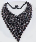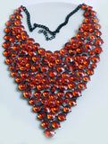 Rhinestone Statement Huge Necklace Bright Red. Set in gun metal. The largest rhinestones are 14mm in diameter. Wearable neck length is 16" The outer edges measure 8" and 7" at it's widest point.