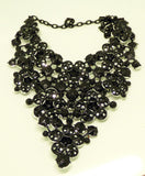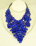 Rhinestone Statement Huge Necklace Bright Blue. Set in gun metal. The largest rhinestones are 14mm in diameter. Wearable neck length is 16" The outer edges measure 8" and 7" at it's widest point.