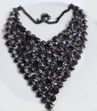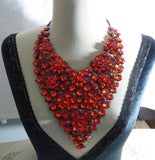 Rhinestone Statement Huge Necklace Bright Red. Set in gun metal. The largest rhinestones are 14mm in diameter. Wearable neck length is 16" The outer edges measure 8" and 7" at it's widest point. circa 1980's.
