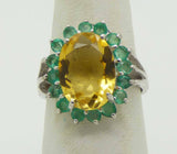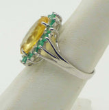 Rich Yellow Citrine and Natural Emerald Solitaire Ring, 14k white gold over sterling silver, Size 7. This has oval and round faceted stones that measure 2.5 to 14 by 19mm. The overall weight is 22.85 cts. Stamped 925. The face of the ring measures 19 by 17mm. Excellent condition.