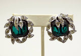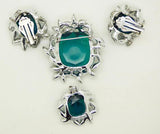 Sarah Cov Emerald Green and Clear Rhinestone Brooch, Pendant and Clip Earrings. Set in silver tone metal. Large emerald green cabochons bordered with silver leaves and clear round faceted rhinestones. The brooch measures 2" in diameter. The pendant is 1" in diameter and the clip earrings are 1 1/4". All pieces are signed Sarah Cov, the earrings are also marked pat pend. Excellent condition. circa 1950's.