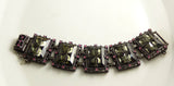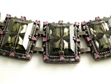This is a collectible book piece. Sarah Coventry Midnight Magic Art Glass Panel Bracelet. Signed Sarah Coventry. Set in antiqued silver tone metal. Black diamond art glass panels accented with hot pink rhinestones. Measures 7 1/2" by 1 3/8". Very good condition.