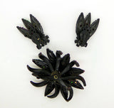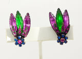 Vintage Selini Colorful Jewel Tone Japanned Demi Parure. This set has stones in Fuchsia Pink, Sky Blue, & Bright Green. Fuchsia Pink, Cobalt Blue and Olivine rhinestones adorn the brooch and clip earrings. All stones are prong set. The brooch is signed and the earrings are unsigned. The brooch measures 2 1/2" in diameter and the clip earrings measure 1 1/2" by 1" Excellent Vintage Condition. circa 1950's.