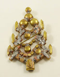 Signed Bijoux MG Rhinestone Christmas Tree Pin, Holiday brooch, X-mas Pin. Set in non-plated brass. This has clear round cut faceted rhinestones, colored rhinestones for bulbs and clear candles. This is a large pin measuring 3 1/2" by 3" Very good condition.