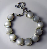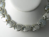 Signed Coro Faux Moonstone Cabochon Choker Necklace. Silver tone with large faux moonstone cabochons, elongated chain link. Hook closure. Measures 16" with 1.5" extension chain, 0.75" wide. Very good vintage condition with some wear to silver plating in back.