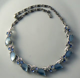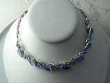 VINTAGE LISNER SIGNED LIGHT BLUE MOLDED LEAVE AND RHINESTONE NECKLACE. This Measures approximately 17" long including hook and extended chain and has molded light blue tear drops with light blue round cut rhinestones.