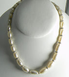 Signed Miriam Haskell Baroque Oblong Glass Pearl Rhinestone Rondelle Necklace. Signed Miriam Haskell on the clasp and the hang tag. Measures 21" in length. The largest pearls are 18mm by 9mm. Excellent condition.