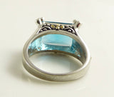 Sterling silver 925 London Blue Quartz Beaded Forget Me Not Ring. Marked 925. The prongs are decorated with tiny white quartz, while the shanks offer an oxidized and gold over sterling Forget Me Not floral accents. Size 9. Very good condition with some wear to the back of the band. circa 1960's.