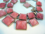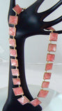 Gold Tone Strawberry Quartz Pyramid Necklace. The stones graduate in size, largest in center (the largest measure 7/8" by 7/8", the smallest 5/8" by 5/8") It's a heavy necklace. Measures 20" in length. It's in excellent vintage condition.