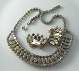 Stunning vintage Juliana Style pink milk glass rhinestone necklace earring set. One of the navette moon glass stones on the necklace is slightly smaller, and slightly off color than the rest. All stones intact, although some have darkened some. Good vintage condition. Necklace measures 16" long with a J hook closure. Earrings are sensational, clip-on, and measure 1 1/2" long.