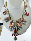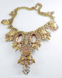 Taboo Vaseline Uranium Glass Peach Dragons Eye Czech Glass Statement Necklace. Set in non-plated brass. Signed Taboo. This has large peach glass oval stones, peachy colored dragons eyes stones surrounded by Vaseline uranium stones. Measures 19" including extender and clasp. The center stone measures 14mm by 20mm. Excellent condition.
