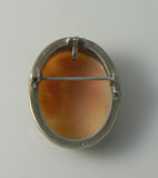 This is a carved shell cameo pendant brooch depicting the Three Graces. The cameo is nicely carved and the piece measures approx 1 3/8" x 1". It is marked "800" on the underside and is in very fine condition showing light signs of wear consistent with age.