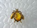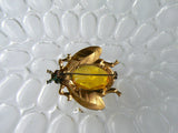This vintage insect brooch is made of gold tone metal, prong-set with a large open-back unfoiled topaz colored Lucite rhinestone. It measures 1 5/8" x 1 3/4" and is in very good condition, with slight verdigris on the backside.