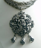 Tortolani Heavy Silver Tone Rose Flowers Necklace Earring Set. All pieces are signed Tortolani. The necklace measures 24" in length and the pendant is 3". The clip earrings measure 1 1/2" in diameter. Excellent condition.