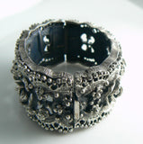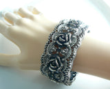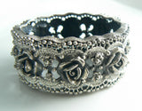 Tortolani roses hinged cuff bracelet. Vintage chunky hinged cuff bracelet featuring roses in a cut work design. The bracelet is signed Tortolani. It has an antiqued silver finish. It measures 1 1/4" wide with a 6 5/8" inner circumference. It has a tongue in groove clasp. Condition is excellent.