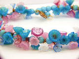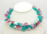 Turquoise Beaded Glass Flower Necklace/Choker. This has 8mm turquoise glass beads. It also has pink, white, teal, light blue and dark rose colored glass flowers. Secure barrel clasp. Measures 17". Excellent condition.