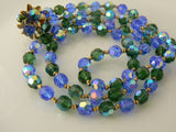 Vendome convertible necklace. It can be worn as a double or single strand opera length. The special clasp can be clamped and worn in front as a pendant with a loop gathered. These quality glass crystal beads are beautiful aurora borealis iridescent blue and green shades. The earrings are signed Vendome, the necklace measures 32" in length and is marked PAT PEND, but no Vendome signature....earrings and necklace clasp match, there is no doubt that this is a set. circa 1960's.