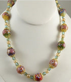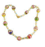 Venetian Wedding Cake Necklace with multi-colored beads. This has multicolored murano wedding cake beads, blush and pale blue glass spacer beads. The wedding cake beads have gold tone filigree bead caps. The beads are approx. 16mm in diameter. Secure box claps. Measures 18" in length. Excellent condition. circa 1940's.