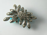 Beautiful, and unique layered brooch. This brooch features sky blue navettes with a star of white, blue aurora borealis rhinestones, and carved sky blue roses. Prong set in silver tone metal. The pin clasp is secure. The brooch is in excellent vintage condition! Measures 3" x 1.5"