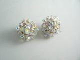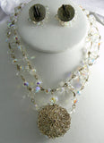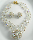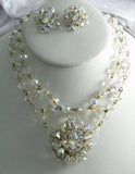 This has 2 connected rows of borealis glass crystals with a 2" centerpiece set in gold tone metal. It has a decorative box clasp. Measures 15 1/2" in length and the clip earrings are 1 1/8" tall. Excellent condition.