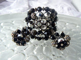 Incredible vintage Alice Caviness beaded bracelet and earrings in silver plated metal. The bracelet is centered by a 1" large bead with prong set crystal rhinestones. Faceted black and silver glass beads make up the rest of the bracelet along with smaller beads with silver end caps studded with ice crystals. Silver squash blossom beads separate the smaller black beads. The bracelet is stung on memory wire and can accommodate up to a 9" wrist.