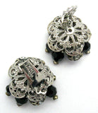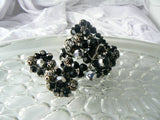 The matching clip earrings are made of beads from the bracelet. A silver faceted bead is in the center surrounded by black faceted beads and squash blossom beads wired to the base with a crystal head pin. They also have roundels of ice crystals caped on each side with a silver flower also wired to the base. They measure 1 1/4" in diameter. The Alice Caviness hallmark is on each clip.