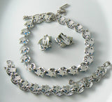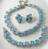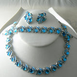 Vintage Aqua Glass Cabs Enamel Leaf Necklace, bracelet, earrings set in silver tone metal. Blue enamel leaves and aqua blue chaton rhinestones with aqua blue glass cabochons. The necklace has a hook clasp, the bracelet has a fold over clasp with safety chain and the earrings are clip. Measures 15 1/2" the bracelet is 7" and the earrings are 1" Very good condition.