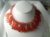 Vintage Art Deco Cherry Juice Bakelite Celluloid Necklace 24 Dangling Paisley's. This adorable vintage authentic Art Deco period necklace featuring 24 dangling paisley or comma shape Bakelite pieces in bright transparent cherry juice suspended by brass jump rings on a transparent red celluloid chain.