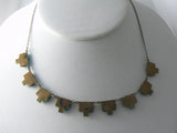 Vintage Art Deco Czech Green Vauxhall Step Glass Choker. Delicate brass colored chain with eight prong set green Vauxhall step glass dangles. Great condition with no chips or cracks to the glass. There is some wear to the metal finish on the back of the links. Measures 16" in length.