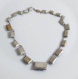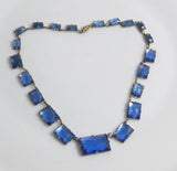 Vintage Art Deco Czech Vauxhall Sapphire Blue Glass Necklace. The pendants are foiled and flat at the back and faceted across the top of the glass to give it sparkle. There is wear and flecking to the foiling, more so to the links at the back of the necklace and in particular one pendant but the front of the necklace is quite bright and sparkly. There are no chips to the glass. Measures 15 1/2" in length and 7/8" x 5/8" at the widest points of the central pendant.