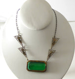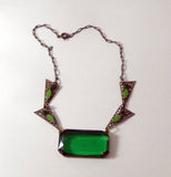 Vintage Art Deco Enameled Filigree and Large Emerald Green Glass Necklace