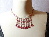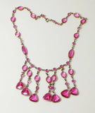 Vintage Art Deco Open Back Bezel Set Pink Crystal Dangle Bib Necklace. This has vibrant pink drops that dangle freely. The glass is bezel set and faceted on both sides. The setting looks like it was silver tone at one time, it now has some brass showing through but still has a nice patina. Measures 16" in length and 2" at it's widest point in front. The smallest cabs are 4mm in diameter. Very good vintage condition.