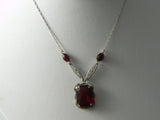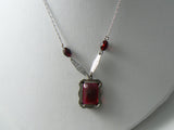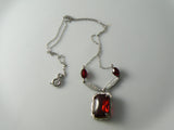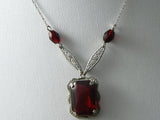 Vintage necklace from the art nouveau to deco era circa 1920's. It features a faceted red stone that is prong set into an open back embossed silver tone setting. The setting hangs between two embossed silver tone links which join to the fine chain by two faceted red beads. The stone has a rich dark ruby red color. The necklace closes with a spring C clasp and is unmarked. The pendant measures approximately 7/8” long and 6/8” wide. The necklace with chain measures 17 3/4" long. The necklace appears to be in very good condition for its age with the exception of a couple of very tiny flea bites on the back and a light scratch on the front right that is only noticeable with magnification and isn't noticeable when worn.
