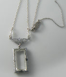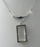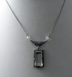 This auction is for a classic necklace from the art nouveau to deco era circa 1920-30. It features a faceted rectangular clear glass stone that is prong-set into an embossed rhodium silver setting which hangs from a rhodium filigree bail. The bail is connected to the fine silver chain by two small faceted clear glass beads. The necklace closes with an embossed pinch clasp. The necklace measures approximately 18” long and is in very good condition.