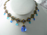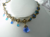 Vintage blue glass and rhinestone dangle necklace. Old gold filigree metal with faceted glass drops of periwinkle and aqua blue colors. Lobster claw clasp. Measures 15" in length with 3" extender. Excellent condition.