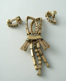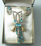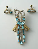 A necklace and earring set made with blue keystone, baguette rhinestones, round and keystone crystal rhinestones set in 12Kt GF. Signed Phyllis 12Kt GF. Comes in the original Meyer Detroit box. The brooch can also be worn as a pendant. Measures 2 3/4" x 1 1/2" and the screw back earrings are 1" long. There are no missing or broken pieces. In excellent condition.