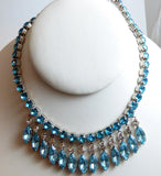 Vintage Blue Rhinestone Sparkling Dangle Fringe Necklace Choker. This is a stunning, high end, prong set blue and clear rhinestone choker. Set in silver tone metal. It measures 14” (35.6 cm) in length and is 1 1/4" (3.2 cm) wide. Excellent condition. circa 1950's.