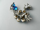 The brooch has Montana blue Rivoli rhinestones set in silver metal. Measures 2 n1/2" wide and 1 1/2" long. the clip earrings measure 1' long and 7/8". The Rivoli rhinestones are open back and the set is in very good condition.