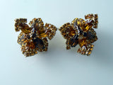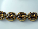The bracelet has a large oval center topaz crystal rhinestone surrounded by smaller amber crystal rhinestones. All stones are open back and foiled. The bracelet measures 7 3/4" in length and a 1/2" wide and has a safety chain. The earrings are an unusual shape with a pointed upward design. The stones are all prong set in gold tone metal. The clip back earrings are marked PAT. PEND MAGICLIP. Each measures 1 1/2" wide and 1" tall.