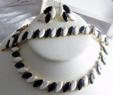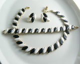 Vintage Crown Trifari Black and White Thermoset Parure set in gold tone metal. All pieces signed Crown Trifari. Measures 15 1/2" in length, the bracelet is 7 1/8" long and the clip earrings are 1" Very good condition with 1 spot on the back of the necklace may have been soldered.