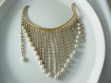 This vintage bib necklace is made of gold tone metal, with dangling gold tone aluminum alloy chains tipped with teardrop-shaped faux pearl beads. The bib section measures 5" x 5", and the necklace is 18 1/2" long, with shepherd's hook clasp. It's in good condition, with slight tarnish on the upper gold tone frame.
