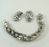 Vintage Designer Quality Ruby Red Bracelet and Earrings. The bracelet has a string of 12 navette stones, in brilliant red. The bracelet and the clip style earrings are set in silver tone metal. The setting of the bracelet is unusual in that the navettes are raised above a double strand of chaton, prong set rhinestones. The clip earrings have four large tear drop shaped stones, accented by smaller, chaton stones. The tear drops are set at an angle so that when worn it would have a fan effect, against the ear lobe. The bracelet measures 7 1/4" in length and the lip earrings are 1 1/4" in diameter. Very good condition.