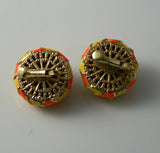 Huge chunky 18 mm. Rivoli watermelon rhinestone. The rhinestones are bezel set in a round circular button shape design. Yellow gold tone metal with a thick ribbed vibrant yellow and faded orange enamel. Measures 1 1/8" in diameter and 5/8" in height.