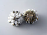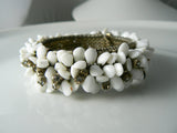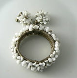 Vintage early unsigned Miriam Haskell milk glass and rhinestone hinged bracelet and earring set. The bracelet is hinged and adjustable, 1" in width. Clip earrings are secure and1.15" in diameter.