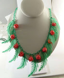 Vintage Early Soft Plastic Celluloid Leaves and Roses Necklace. Green celluloid chain, soft plastic green leaves with red roses. Measures 20" in length, the leaves are 2" and the roses are 1/2" Very good vintage condition.