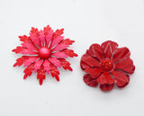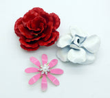 Vintage Enamel Flower Pins, Brooch Lot, Reds and Whites. The largest red and pink flower measures 3" (7,62 cm) in diameter. The smallest is 1 3/4" (4.445 cm) in diameter. They are in very good to excellent condition.