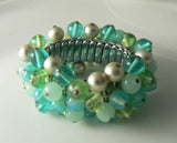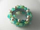 Great vintage expansion Cha Cha bracelet marked Japan on the expansion band. 4 different colors of glass beads, all in shades of green/blue/blue green plus faux pearls. A beautiful and unusual expansion bracelet in great vintage condition. Dimensions are 3" and up to about 3 times that when stretched.